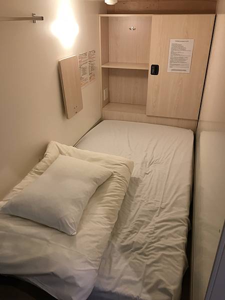 床位本身設計實在太得我心,不僅有不透光的簾子,還有可上鎖的床頭櫃,也有折疊式的小桌子跟衣架。就是因為看到這個床頭櫃跟摺疊桌,才下定決心要住在這裡,畢竟一些隨身物品要帶來帶去也很麻煩,有上鎖櫃的話至少可以安心去上廁所或洗澡,不用擔心東西被偷,而且這裡的鎖是由旅館提供鑰匙,不像多數青旅要自備鎖頭,(不過各床位的鑰匙會不會是通用的?這就不得而知了)